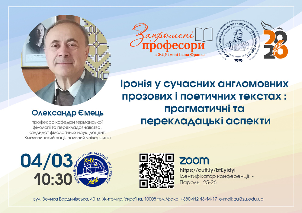 Тому я із задоволенням виступив як запрошений професор з лекцією про іронію у прозових і поетичних текстах для магістрів і студентів ЖДУ на запрошення зав. кафедри Н.Д. Борисенко. Наталія Дмитрівна, до речі, була головою ЕК у нас під час держіспитів.