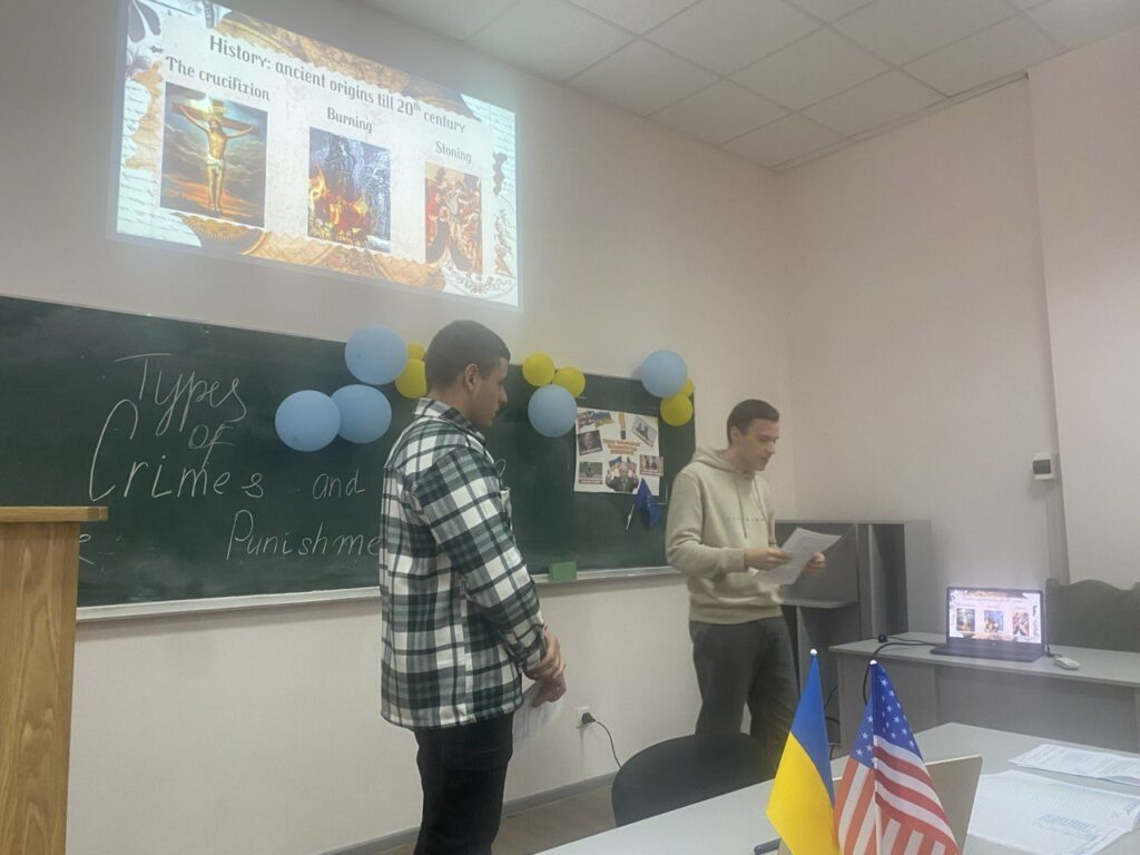 Метою заняття було формування комунікативних умінь і навичок усного мовлення, розвиток аналітичного мислення під час обговорення теми злочинів і смертної кари, а також ознайомлення з основною юридичною лексикою та видами покарань.